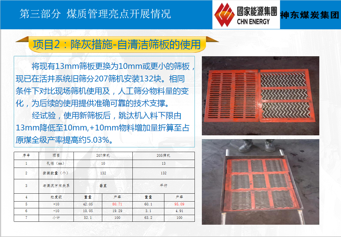 大柳塔洗煤(mei)廠207原(yuan)煤(mei)分級篩(shai)(shai)(shai)(shai)更(geng)換(huan)了(le)132塊篩(shai)(shai)(shai)(shai)板(13mm傳統(tong)篩(shai)(shai)(shai)(shai)板換(huan)成10mm自清潔(jie)篩(shai)(shai)(shai)(shai)板),經計量,更(geng)換(huan)后原(yuan)煤(mei)總量不變,篩(shai)(shai)(shai)(shai)上入洗原(yuan)煤(mei)增(zeng)(zeng)加(jia),增(zeng)(zeng)加(jia)量折(zhe)算至占原(yuan)煤(mei)全(quan)級產率提(ti)高約(yue)5.03%。